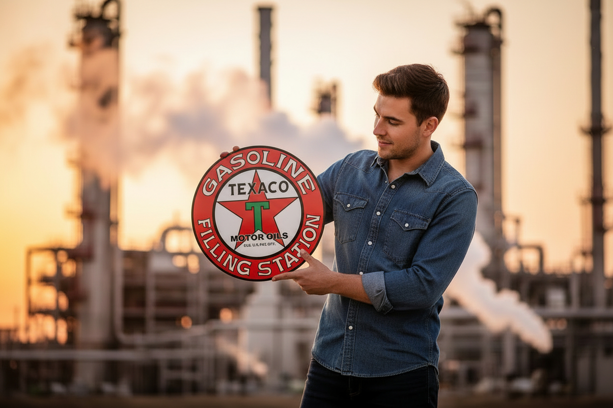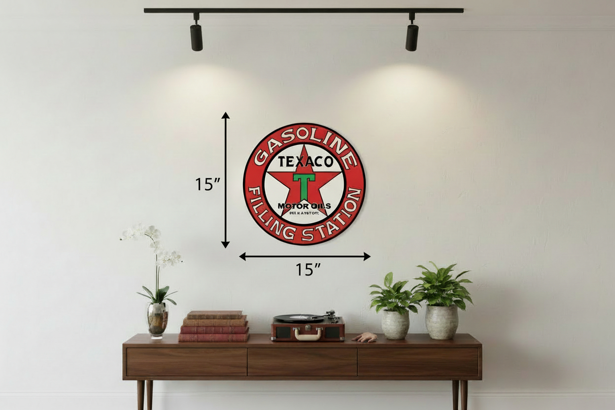 Elevate your space with the iconic Texaco Motor Oil Filling Station sign, a stunning reproduction crafted from durable 14-gauge steel. Finished with a robust powder coat base, this sign not only showcases the classic Texaco logo but also ensures long-lasting quality and resistance to the elements. Proudly made in the USA, it’s the perfect addition for collectors, automotive enthusiasts, or anyone looking to add a touch of vintage charm to their decor. Make a statement and celebrate American automotive history with this timeless piece.